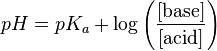 In monoprotic acids, the point halfway between the beginning of the curve (before any titrant has been added) and the equivalence point is significant: at that point, the concentrations of the two species (the acid and conjugate base) are equal. Therefore, the Henderson-Hasselbalch equation can be solved in this manner: